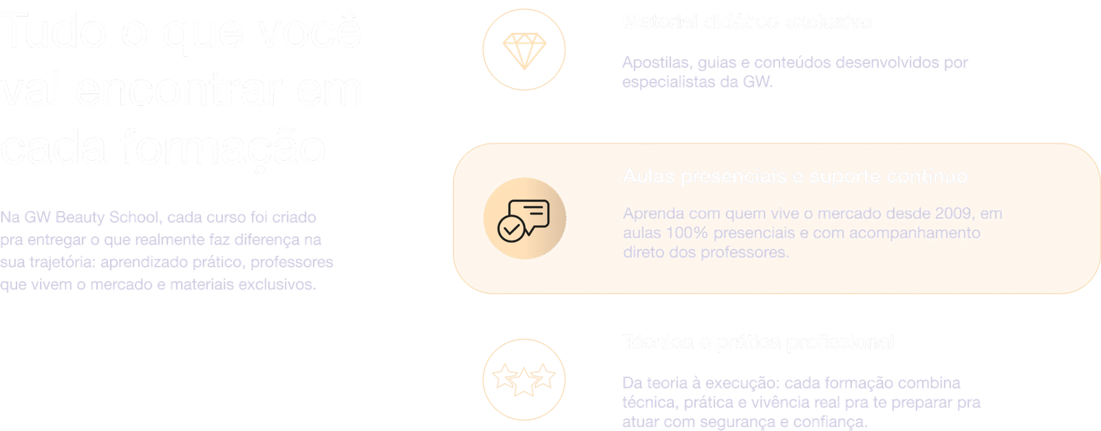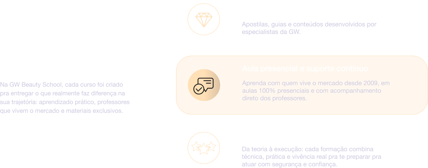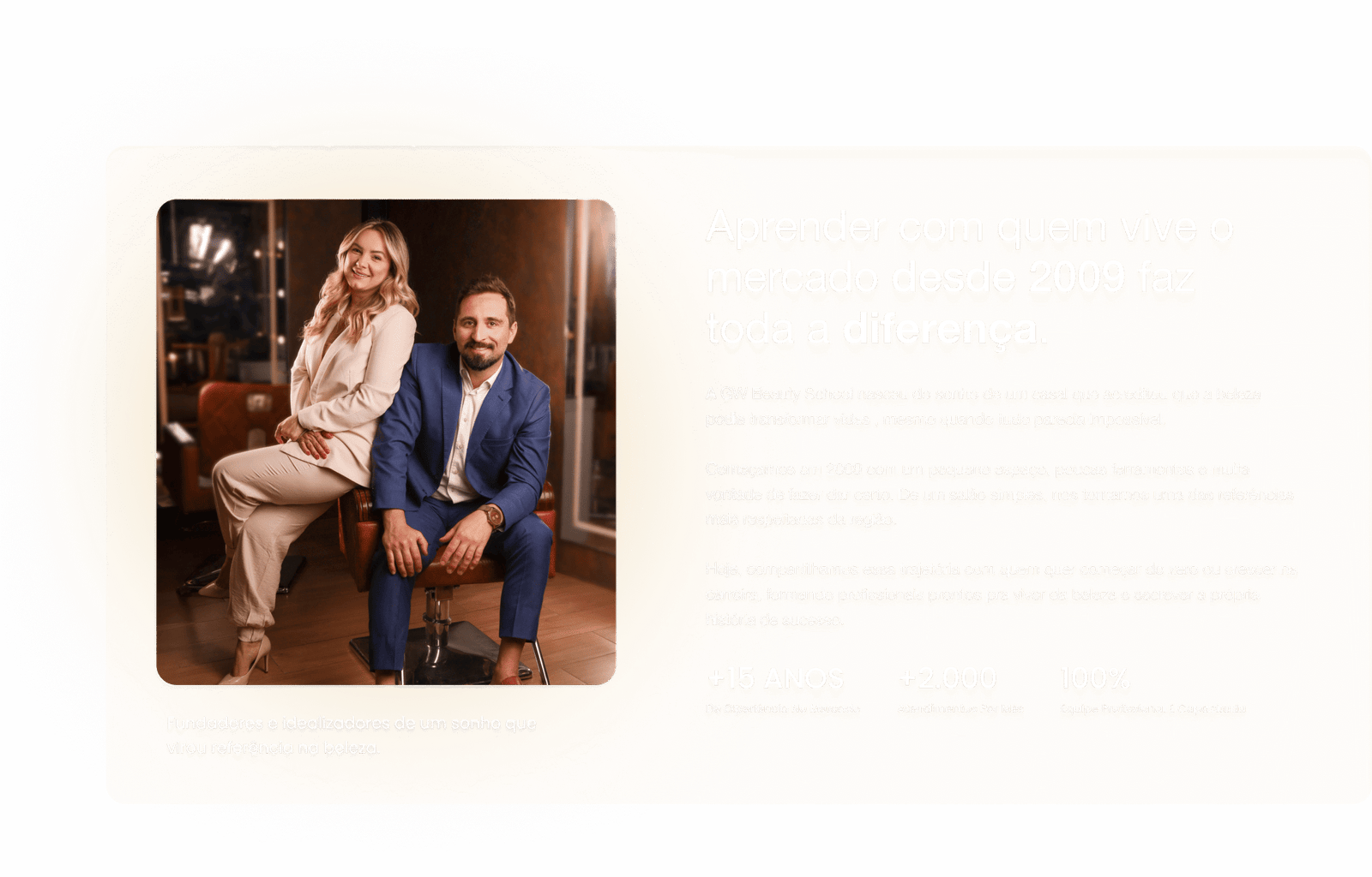 Ao longo de quase duas décadas de experiência, Welington e Gislane realizaram os melhores e mais renomados cursos do Brasil e do exterior — como Pivot Point, Keune Trainer, Wella Expert, Barber Day com Seu Elias, entre muitos outros. Essas formações os tornaram referência na área da beleza. Com base em todo esse conhecimento e na vivência do dia a dia de salão, desenvolvemos uma metodologia própria e simplificada, que reúne o que realmente funciona na prática. Nosso objetivo é transformar você em um grande profissional, preparado para se destacar no mercado.